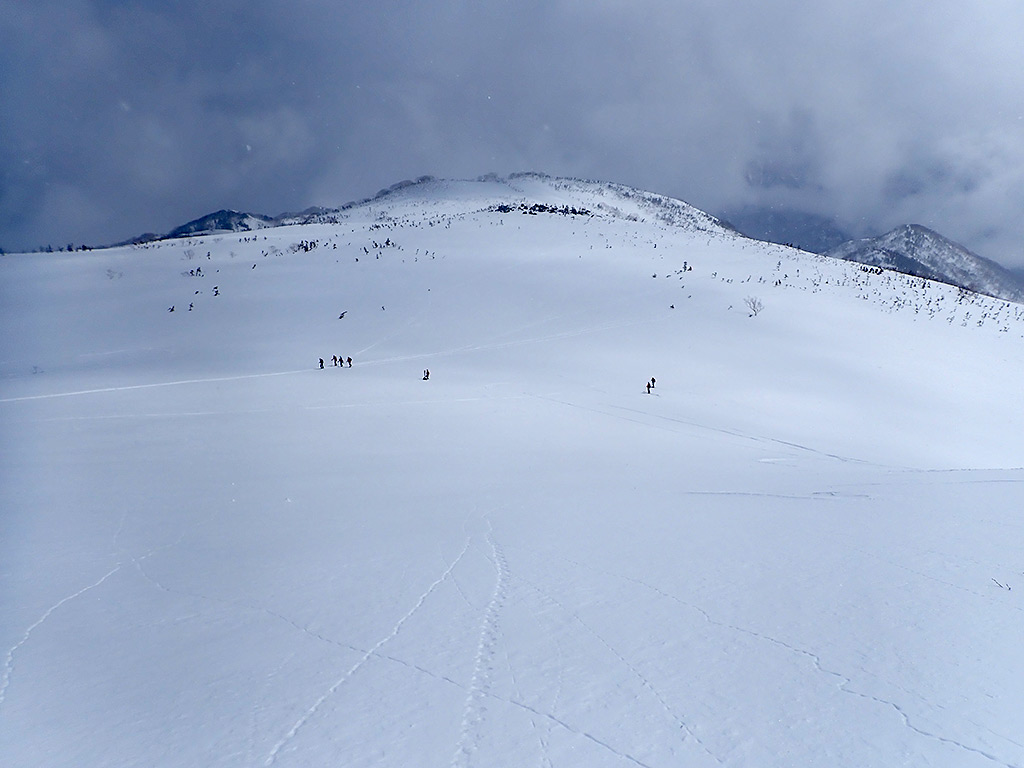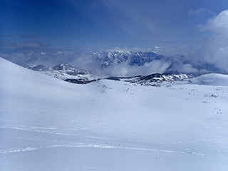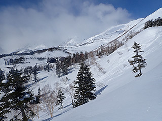 祠のあたりを通過。正面に白馬乗鞍岳の広大な東斜面。