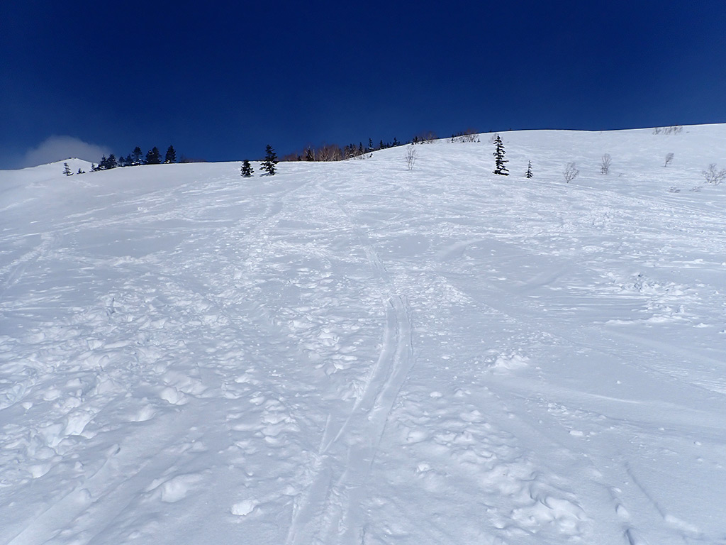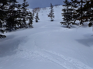 ここは20cmほどのもっさり重めのパウダーでした。もなかが緩んだのか元々そういう雪質だったのかは?。