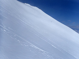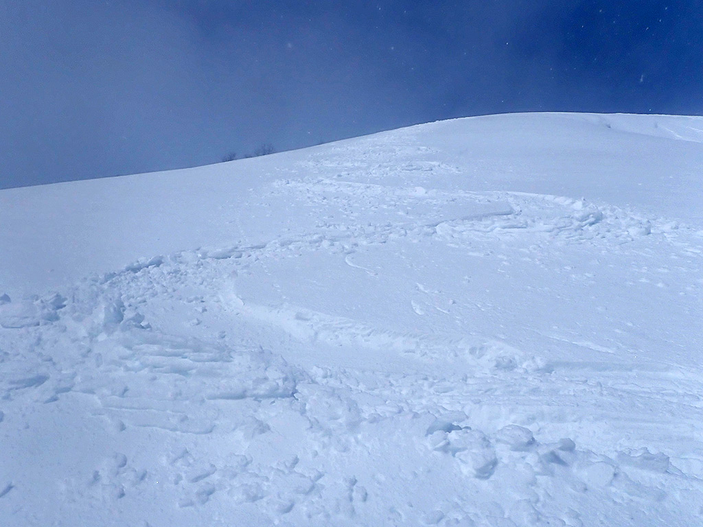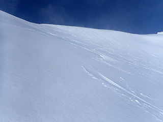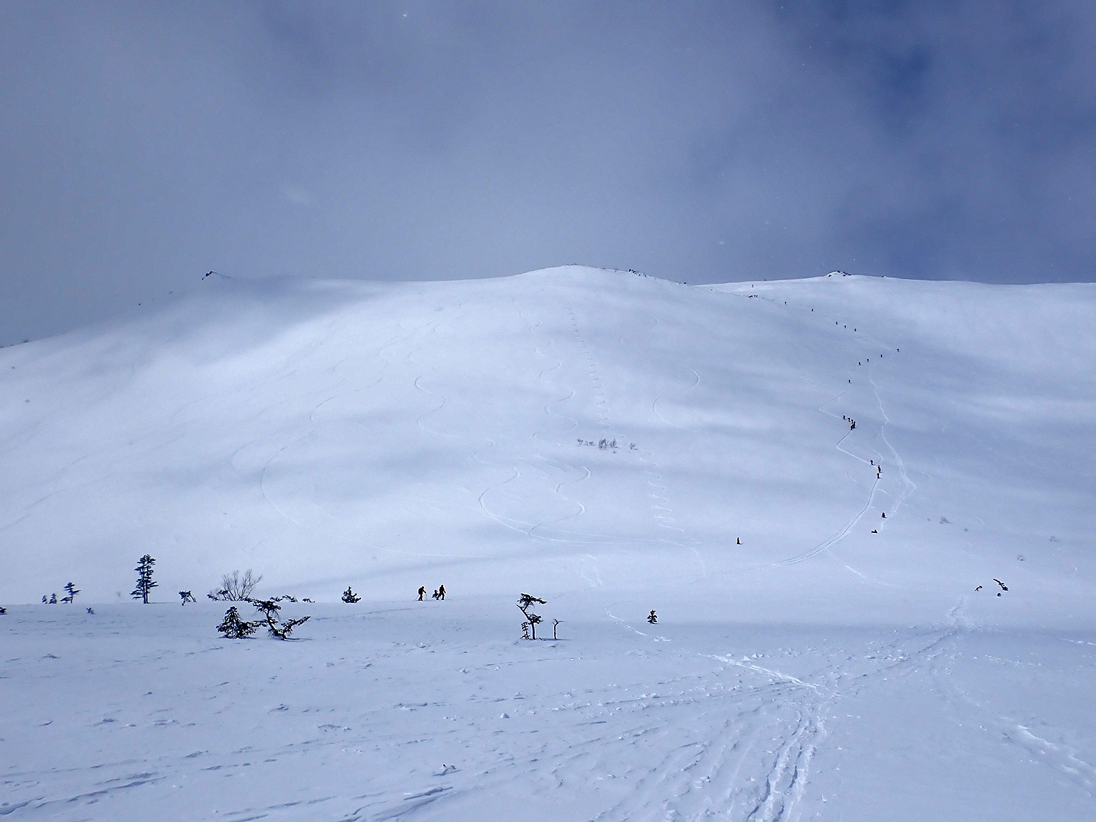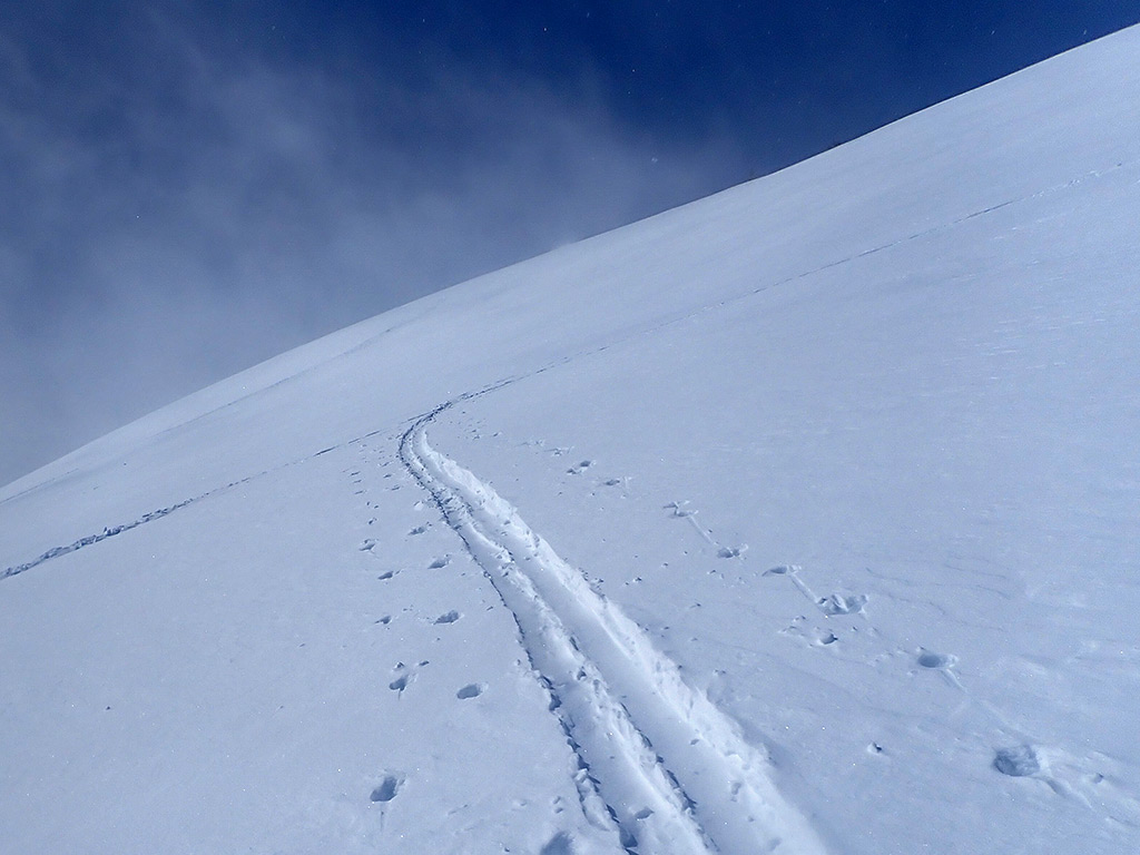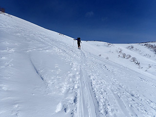 この辺りから時々強風が。先行者のシュプールも埋まってきています。