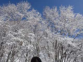 昨日の降雪と今朝の冷え込みによる霧氷で木々が真っ白。