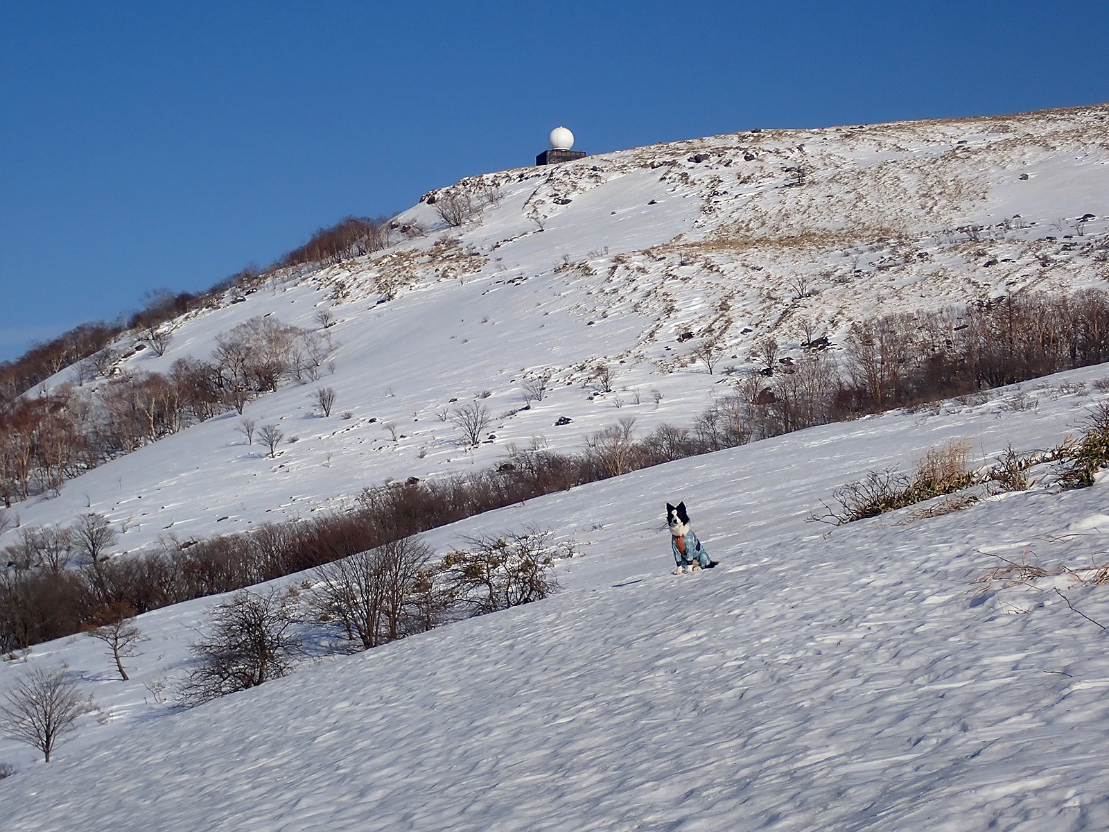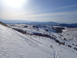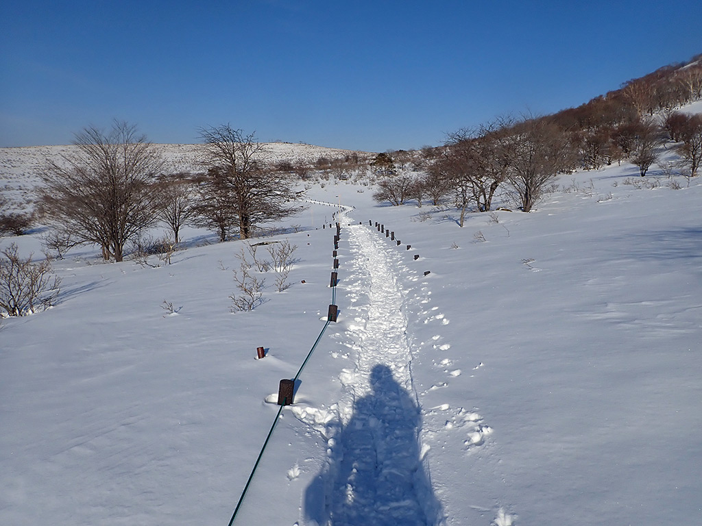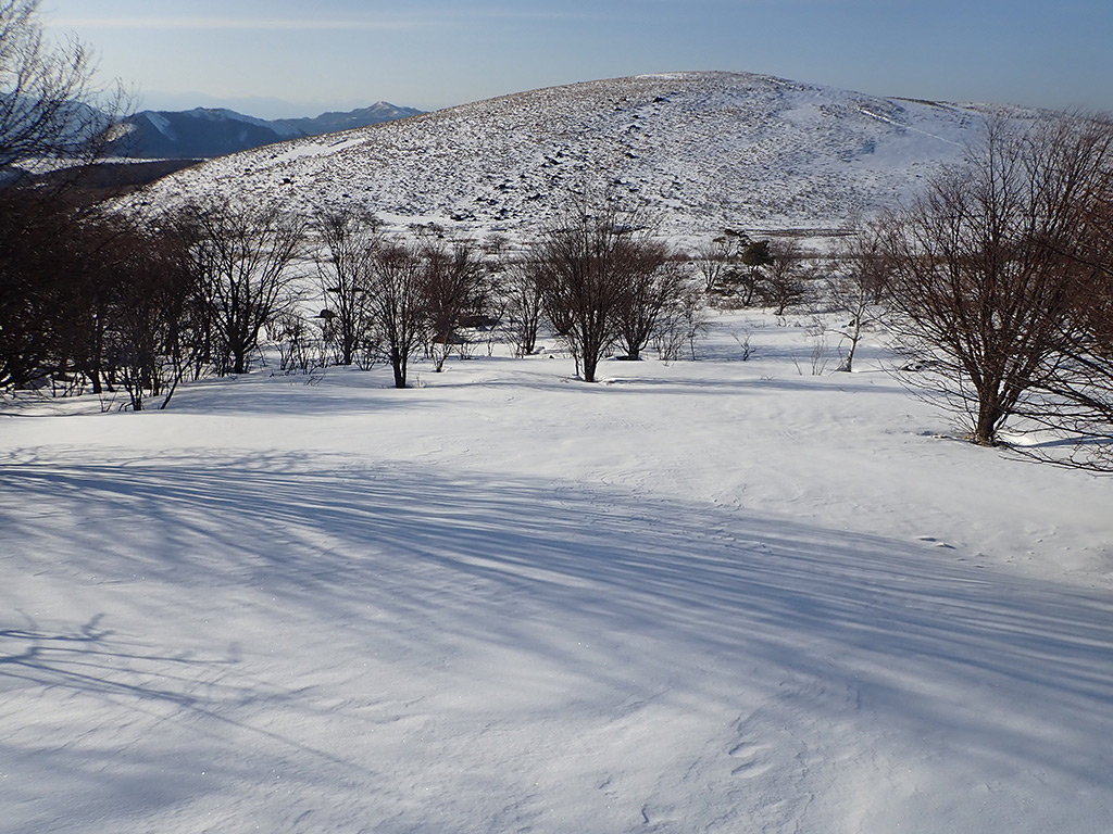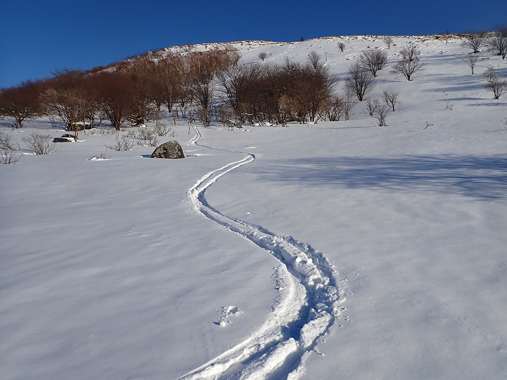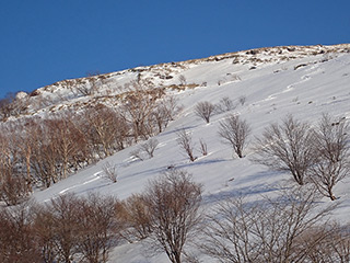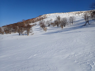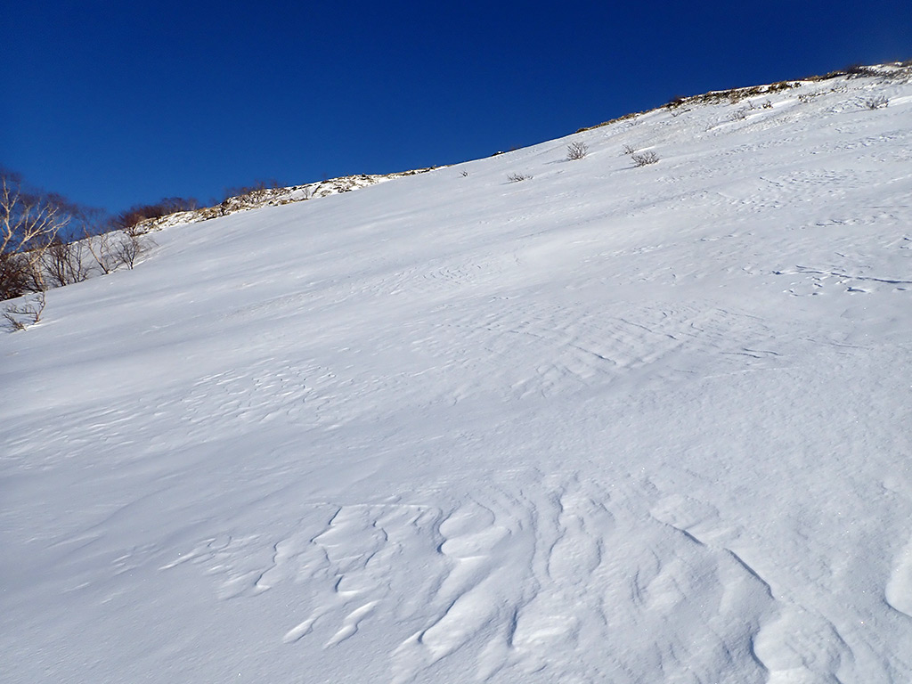ここが今回一番のカチカチ斜面。新雪が飛ばされてクラストバーンが出ています。雪が緩んでいないと、スノーシューあるいは何らかの滑り止めが無いと通過は難しいでしょう。