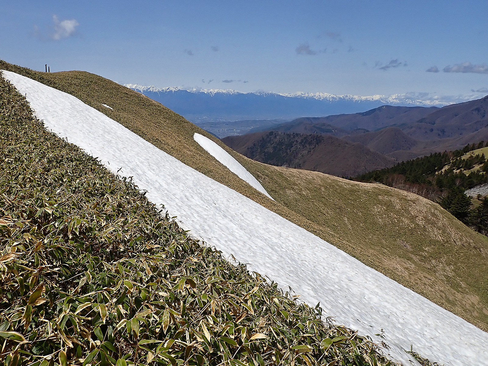 山頂手前で東斜面を見下ろします。予想以上に雪解けが進んでいました。