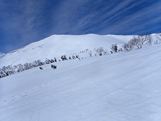 船越の頭の斜面。稜線直下の斜面は真っ白でおそらく新雪が積もっていそう。ただそこまでの斜面がなあ。前回のかちかちの恐怖がよみがえります(^^;。