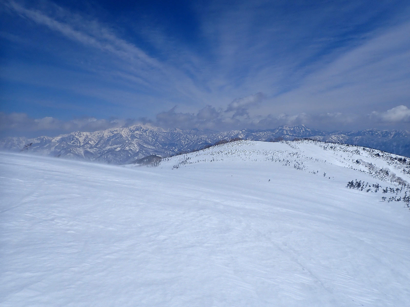 白馬乗鞍岳。こちら側も新雪とかちかちのまだら模様。