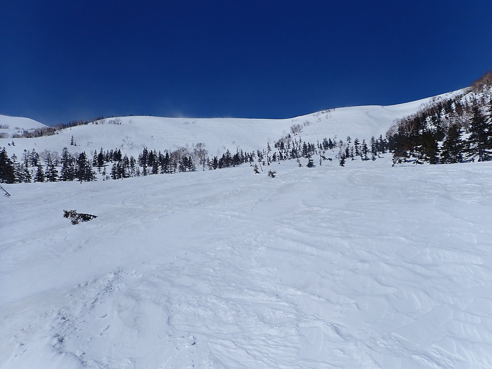 ここはちょうど風が当たっているので新雪は飛ばされるかハードパックか。