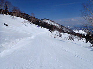 林道、そしてゲレンデを滑り降ります。林道の中間辺りからやっと少しだけざらめっぽくなってきました。