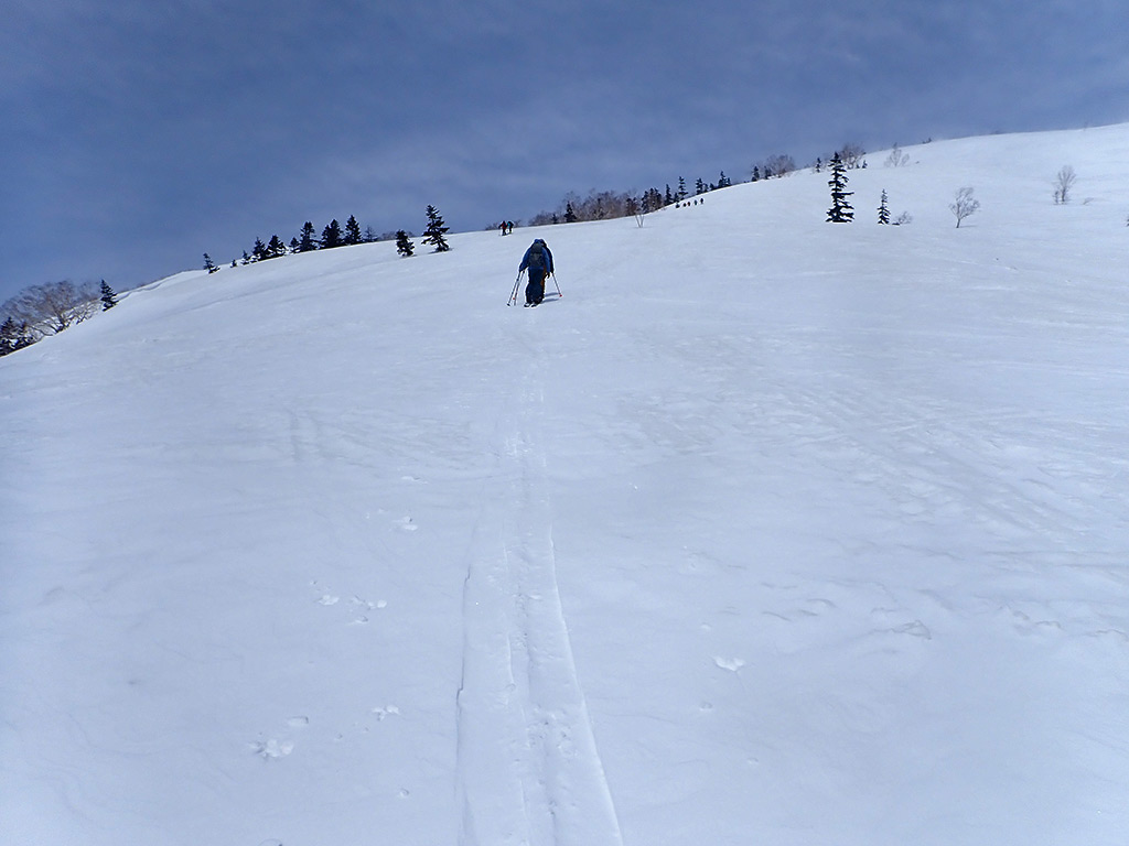 天狗原に登る斜面もパックスノーとクラストのまだら模様。それでも帰る頃には日差しで少しは緩むのではと期待しましたが甘かったです(^^;。