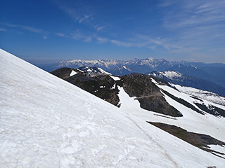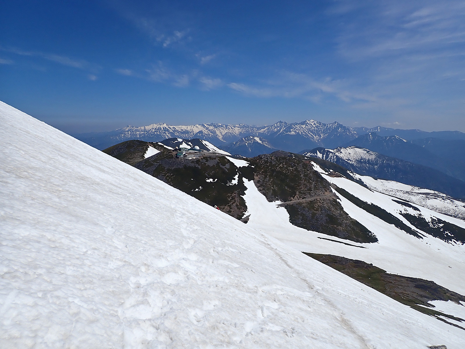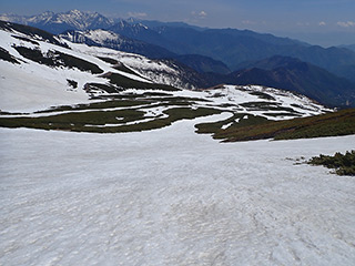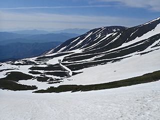 剣ヶ峰と蚕玉岳の間の斜面。まだ稜線から雪はつながっています。