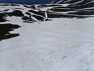 畳平でのんびり時間を潰して次のバスで下ります。下り始めてすぐの斜面にもシュプールが見えます。