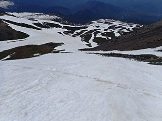 次の雪の斜面のトラバースが今回歩いた中で一番緊張しました。朝は雪が締まっているのでアイゼンが良く効きますが、緩んでくるとちょっと心配。まあ多くの人が歩くのでステップが出来そう。