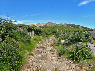 剣ヶ峰までの登山道脇にはそれなりに花は咲いていましたが、お花畑というほどでも無くという感じでしたが、摩利支天山へのトラバースルートはいろんな花が咲いていてお花畑状態で楽しめました。