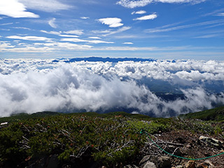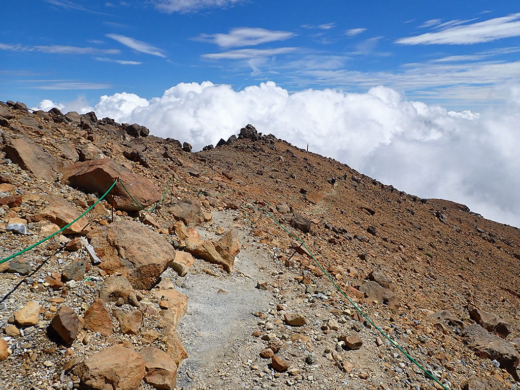 9時ちょうど、稜線に出ました。剣ヶ峰が見えてきました。ガスがどんどん湧いてきているので、早く山頂に立って展望を楽しみたいと、山頂に急ぎます。