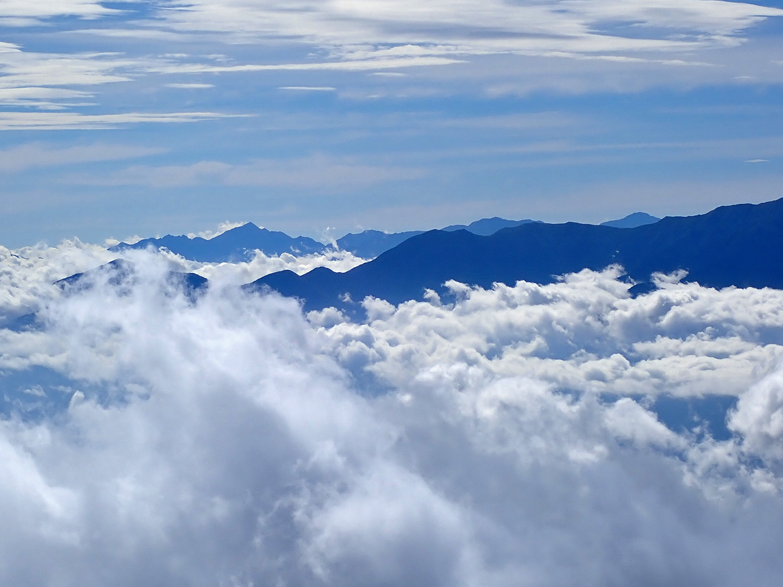 振り返ると中央アルプスの向こうに甲斐駒。この時間はガスがあまり湧いていなかったようです。