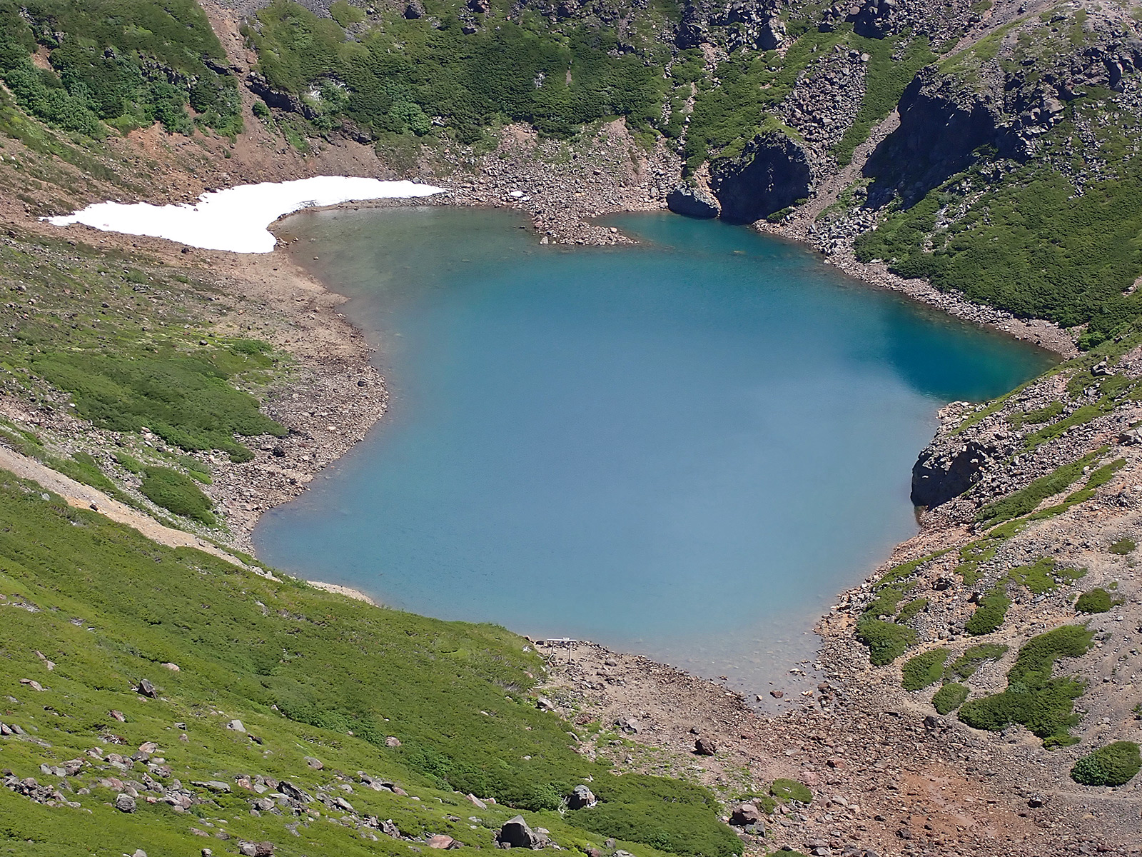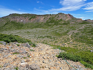 混雑を避けてこちら側の登山道に進みます。この斜面は積雪期に何度も稜線からすべ降りたのが懐かしいです。
