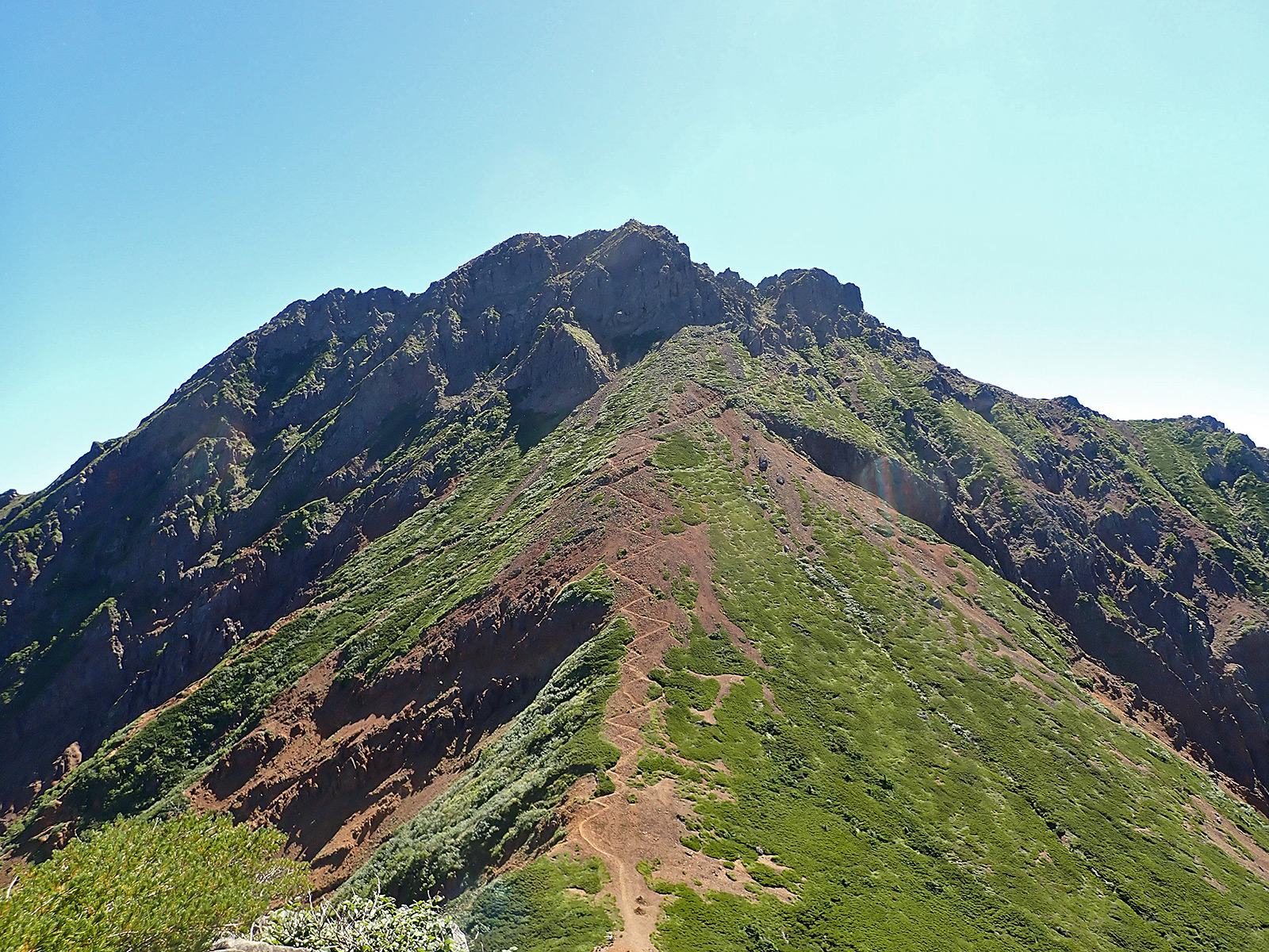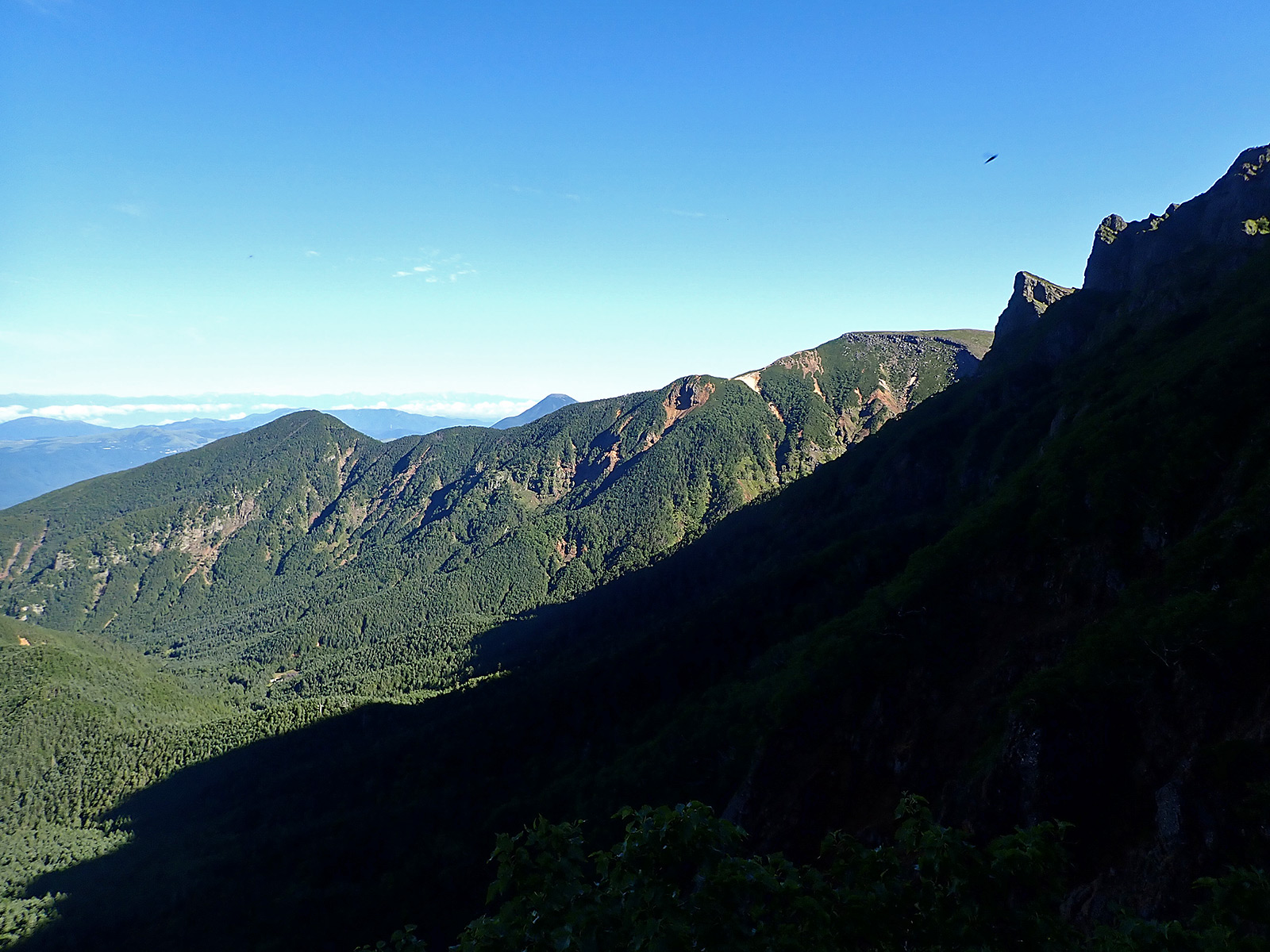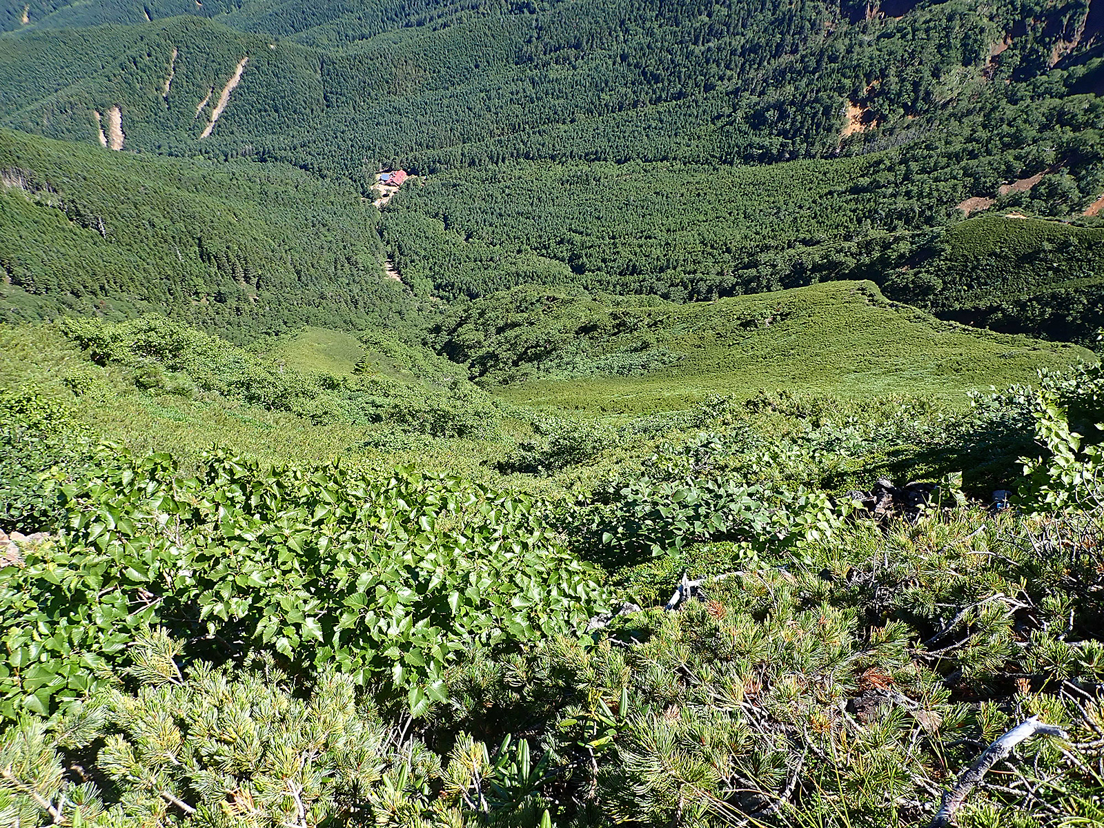 北面。いつか冬季にこの斜面を滑ってみたいと思いつつ、問題は最後落ち込んでいった先です。