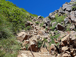 9時52分、中岳と阿弥陀岳のコルからこれから登る斜面を見上げます。まるで壁に見えます(^^;。