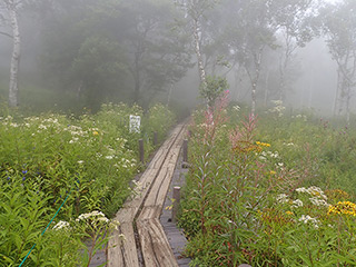 入笠湿原。到着時点は濃い霧(^^;。