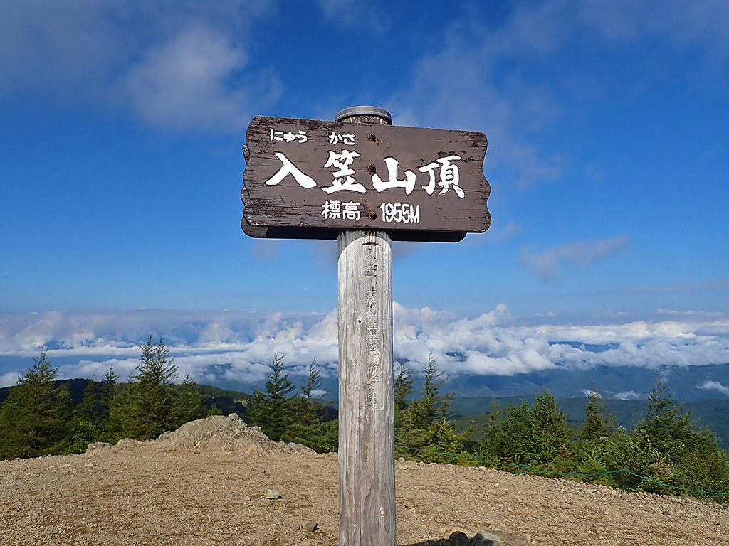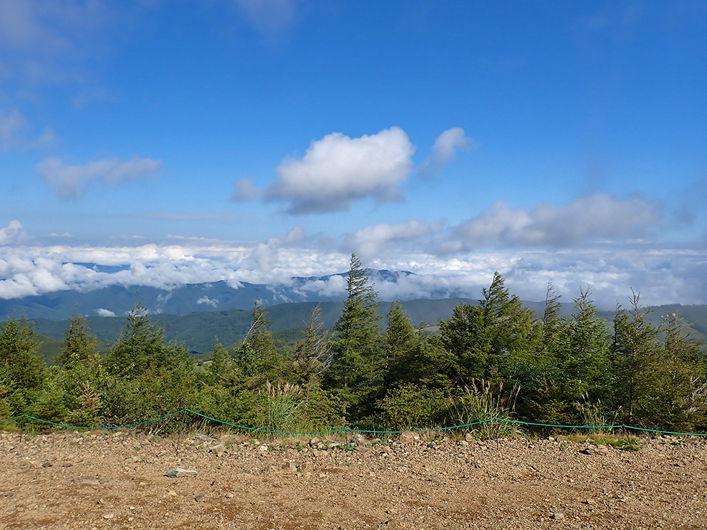 山頂。ガスがもう湧いてきていますが、西側はまあまあの天気。ただし雲海+山に雲がかかり始めているようで、ほとんどの山は見えません(^^;。残念。