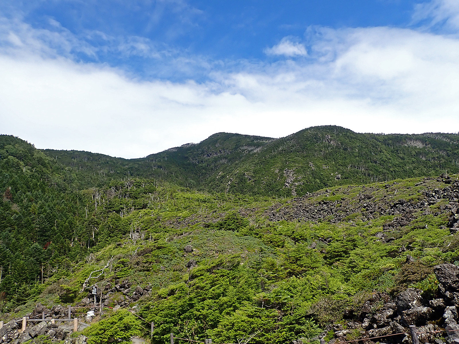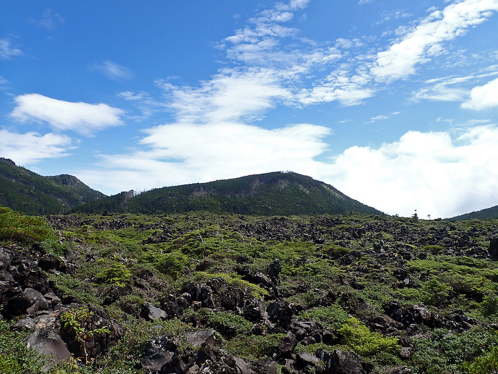 駐車場に戻ってきてきて、北横岳を振り返ります。稜線がきれいに見えていますね。今日は北八はガスもそれほどかからず、まあまあの良い天気でした。