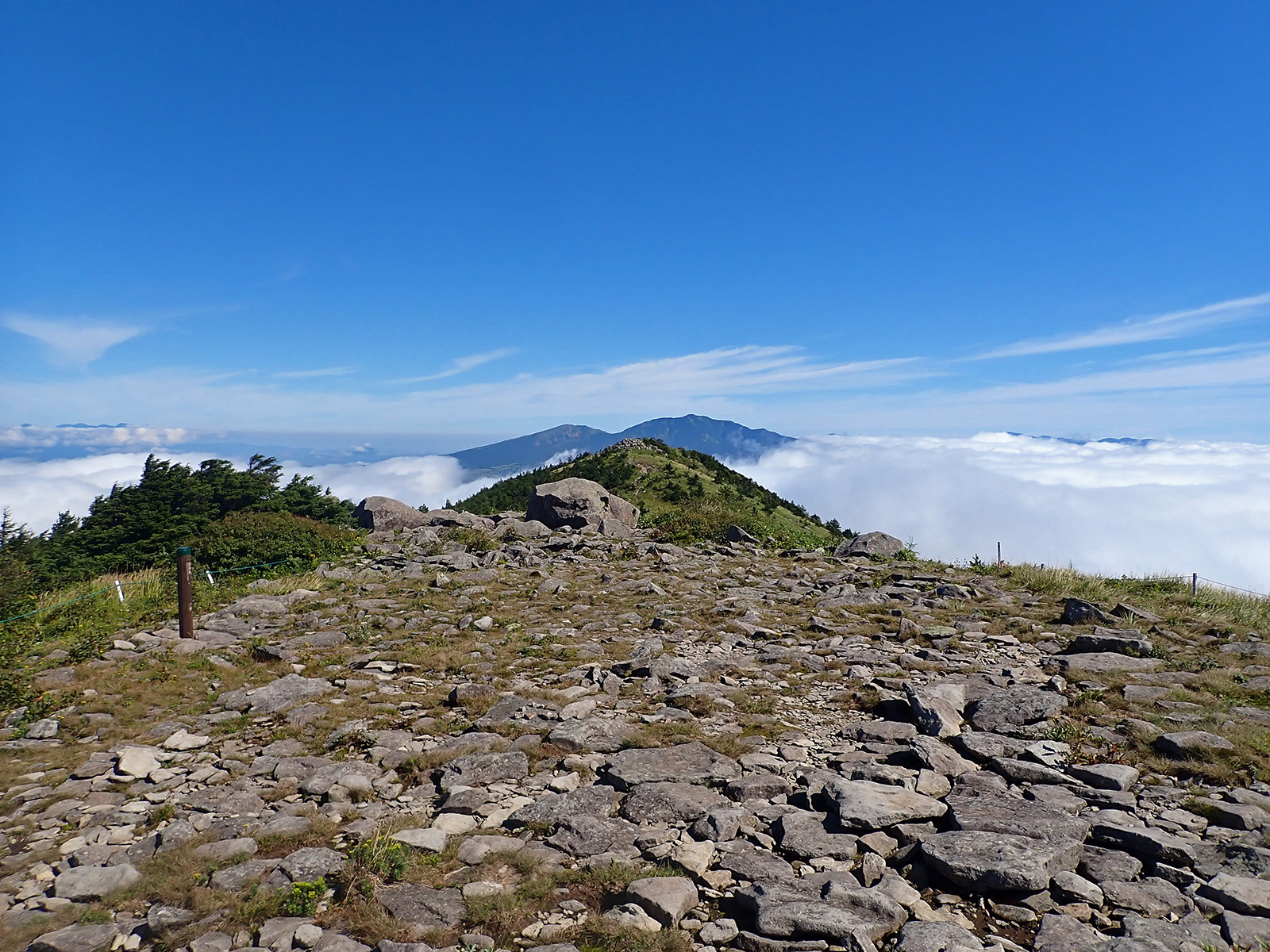8時58分、湯の丸山南峰に到着。烏帽子岳に少しガスがかかっていますが、北アルプスはずらり見えています(^^)。
