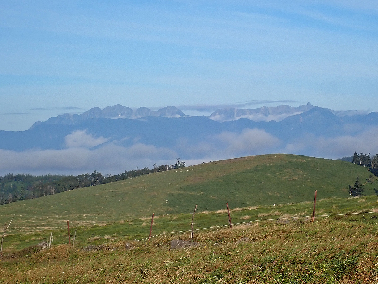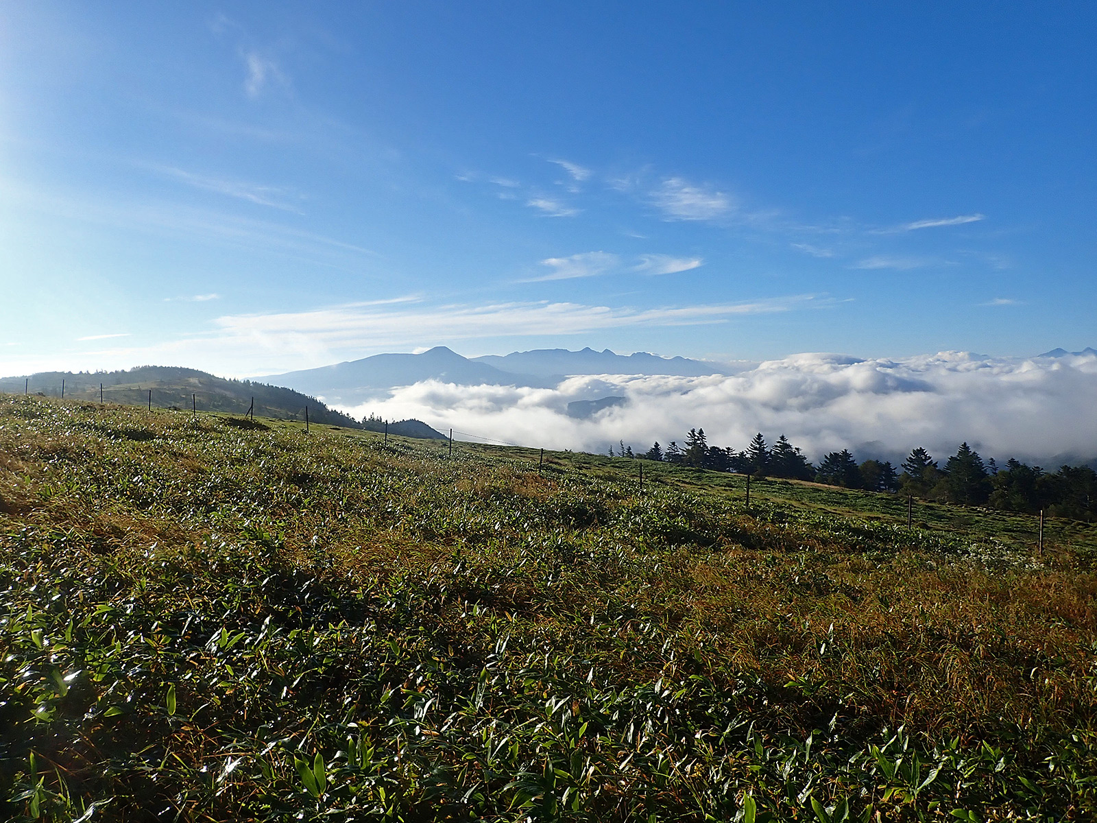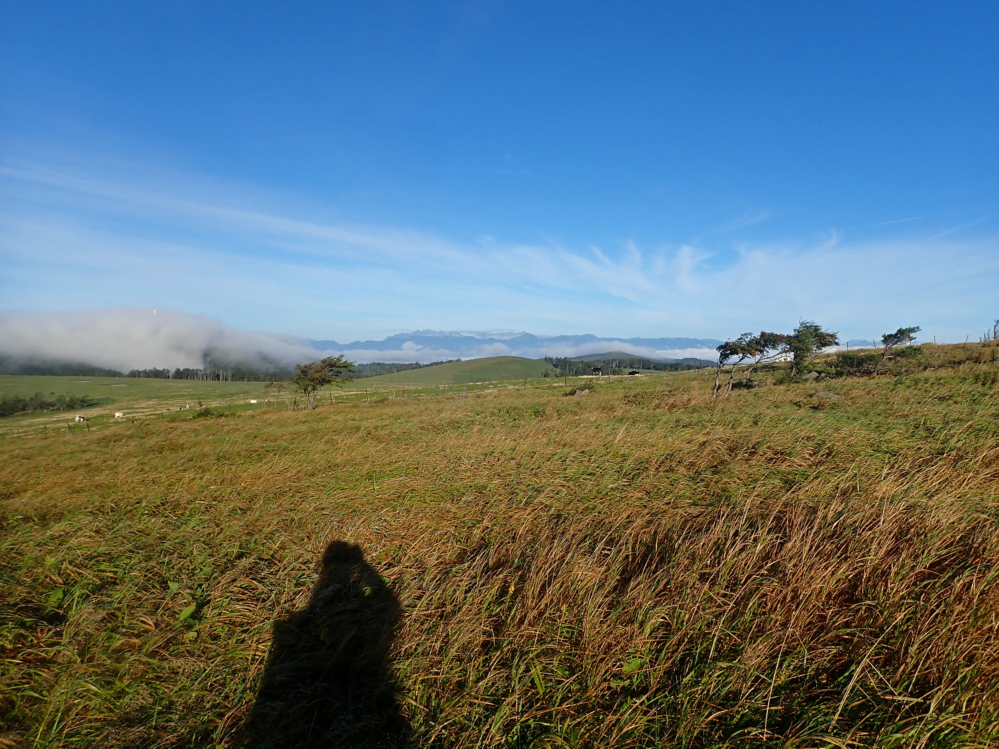 この日の早朝、少なくとも朝8時頃までは快晴ではと大いに期待して、美ヶ原に秋の花と展望を楽しみに出かけてきました。到着時点は期待通りの快晴でしたが、まもなく王ヶ頭にガスがかかり始め、あれよあれよという間に美ヶ原全体が真っ白に。ダメ元で王ヶ鼻まで行き、1時間は粘るつもりで晴れ待ちをはじめたところ、少しして少し青空が見えるかなと思ったら一気にガスが切れ始め、大展望を楽しむことが出来ました。