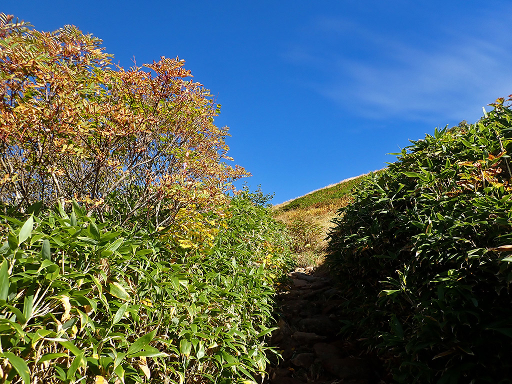 登山道はまだほぼ緑ですが、所々で紅葉が始まっています。