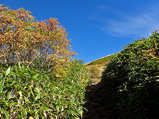 爺ヶ岳はこの辺りが紅葉ポイント。登山道の脇に赤や黄色の紅葉が見えています。