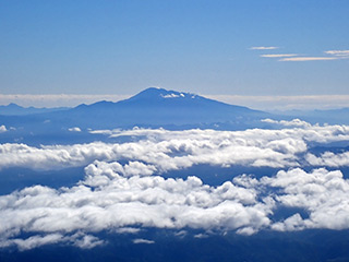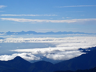 振り返って。雲海の上に八ヶ岳、富士山、南アルプスが見えています。