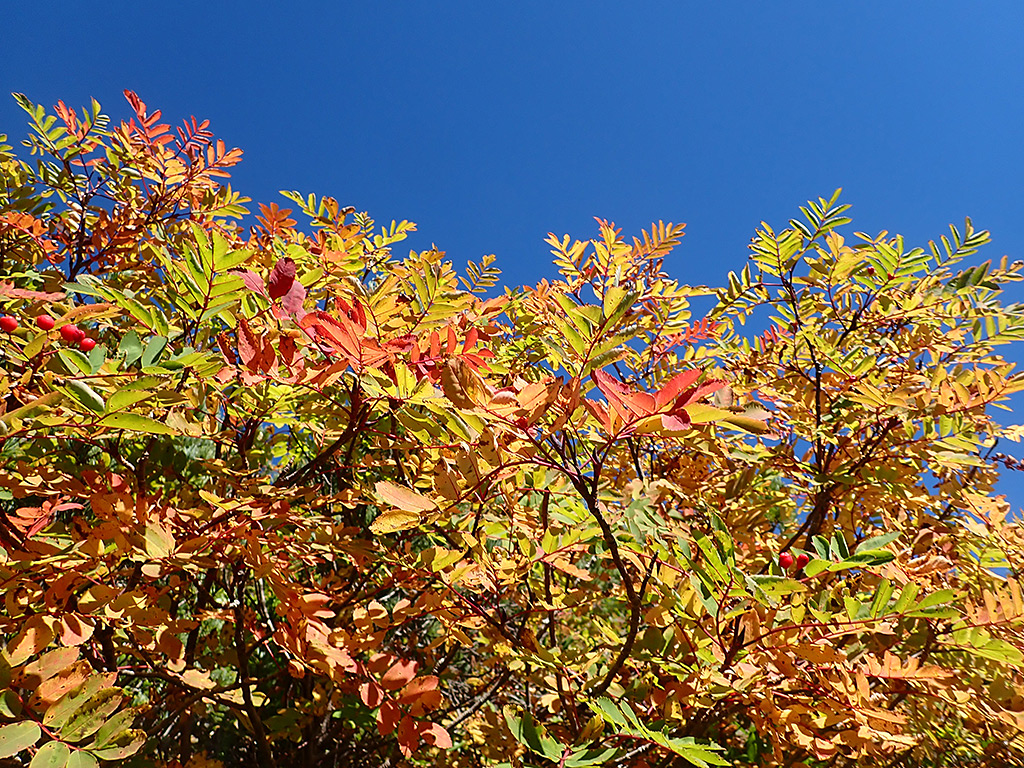 緑から赤までバリエーション豊富なナナカマドの紅葉。