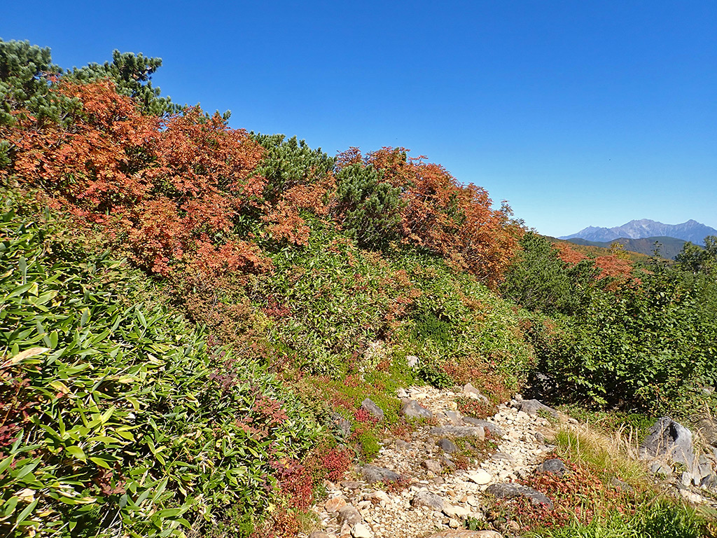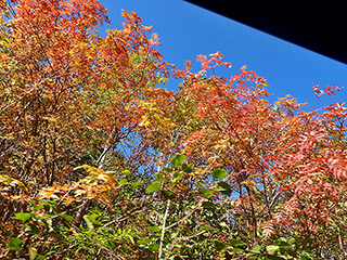 少し歩いていつもの撮影ポイントより。手前のナナカマドはまだダイダイの手前くらいか。