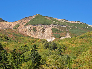 蚕玉岳、朝日岳。残雪はもうあんなに小さくなりました。でもスキーを持ったスキーヤーも乗っていました。