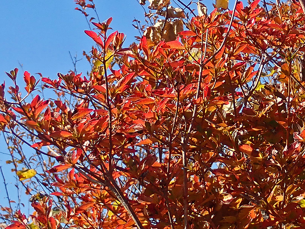 小屋の裏の橋を渡った先に何本かのもみじがあります。この株はだいぶ赤くなってきました。