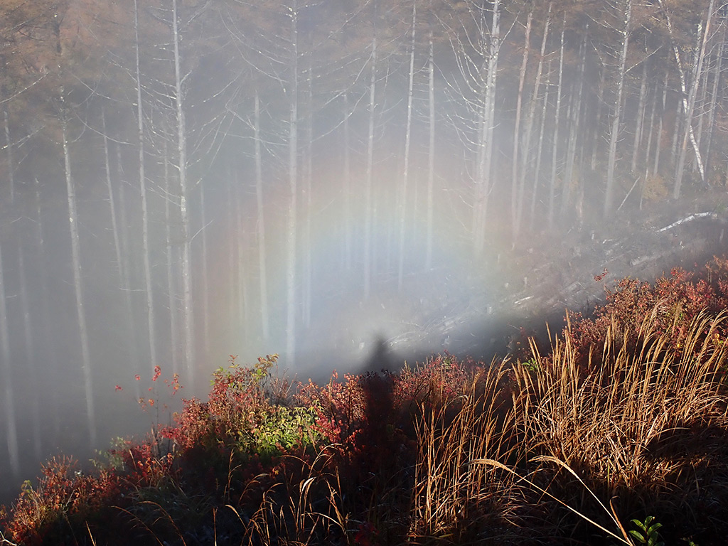 到着時点はガスがひっきりなしに流れてきて、ガスと空しか見えない状況でした。でも斜面の下の方に何やら虹のようなものが。