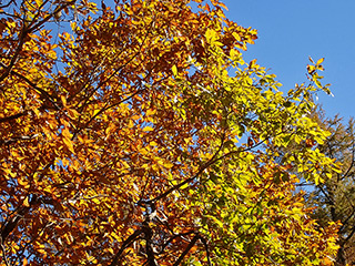 次の2枚は車を駐めた場所の近くのもみじ。この大きなもみじはまだ色付き始め。