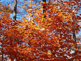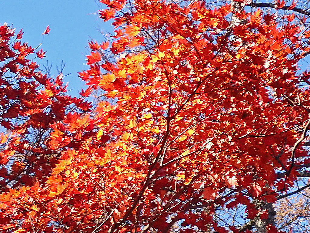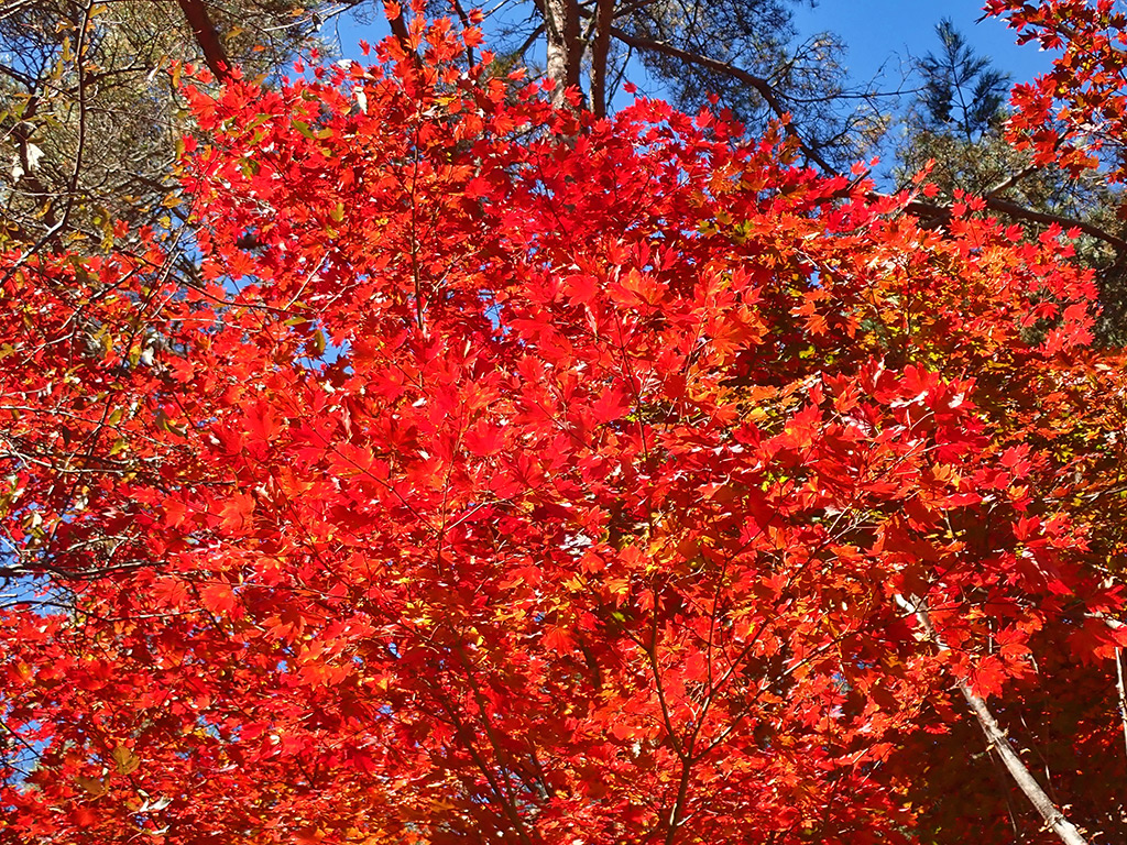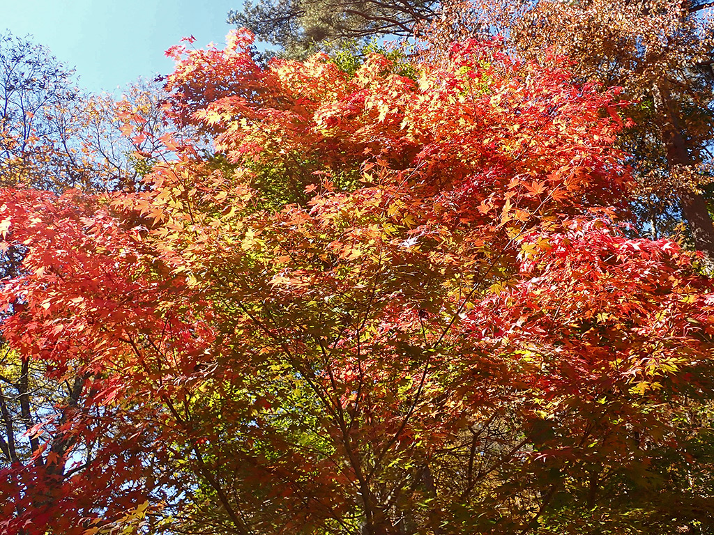 杖突峠側の紅葉の様子を見たいと思い、杖突峠側に下っていきます。すぐに目立つ大きなもみじ。ちょうど見頃。