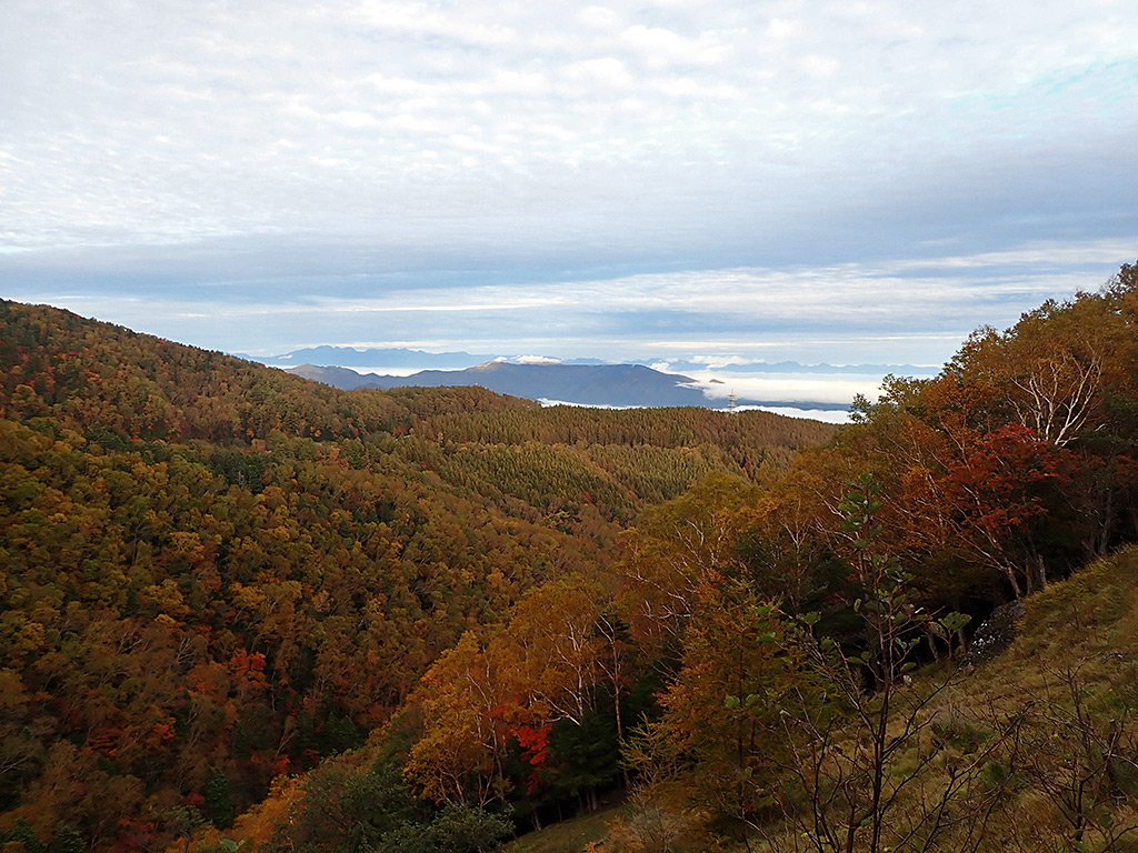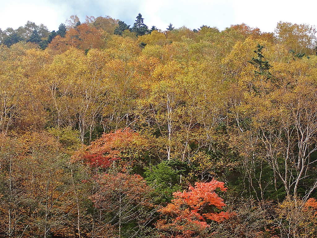 ここからは車で帰る途中で撮影した紅葉です。大河原峠から七合目は道路脇の斜面が一面見頃を迎えています。この林道を走るだけでもたっぷりの紅葉が楽しめます。
