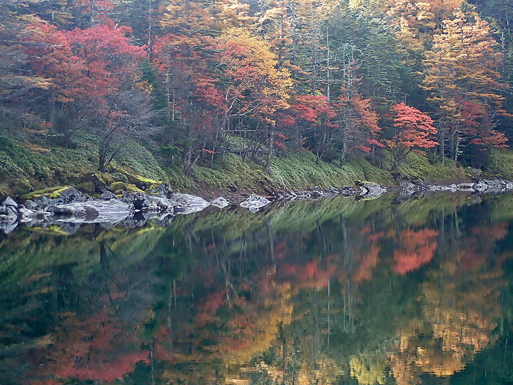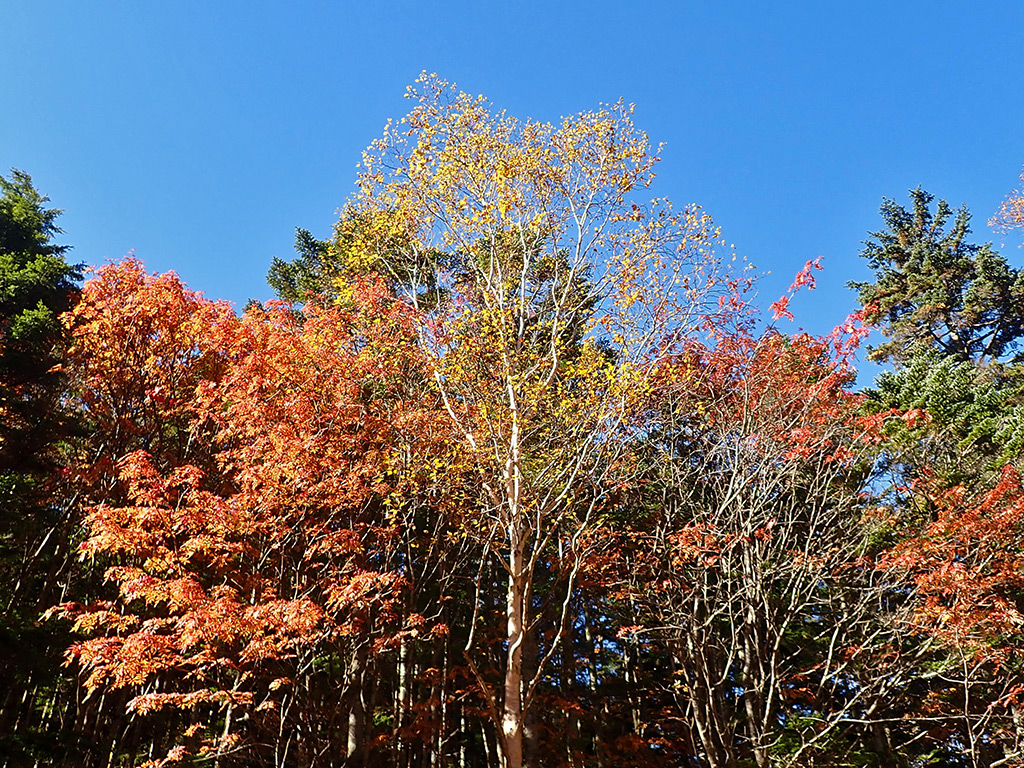 蓼科山七合目登山口から大河原峠にかけて、周囲の斜面の紅葉はちょうど見頃を迎えていて見事でした。双子池、亀甲池の紅葉もちょうど見頃だと思います。この日は風もほぼ無く、朝は水面がほぼ鏡できれいな映り込みも楽しめました。