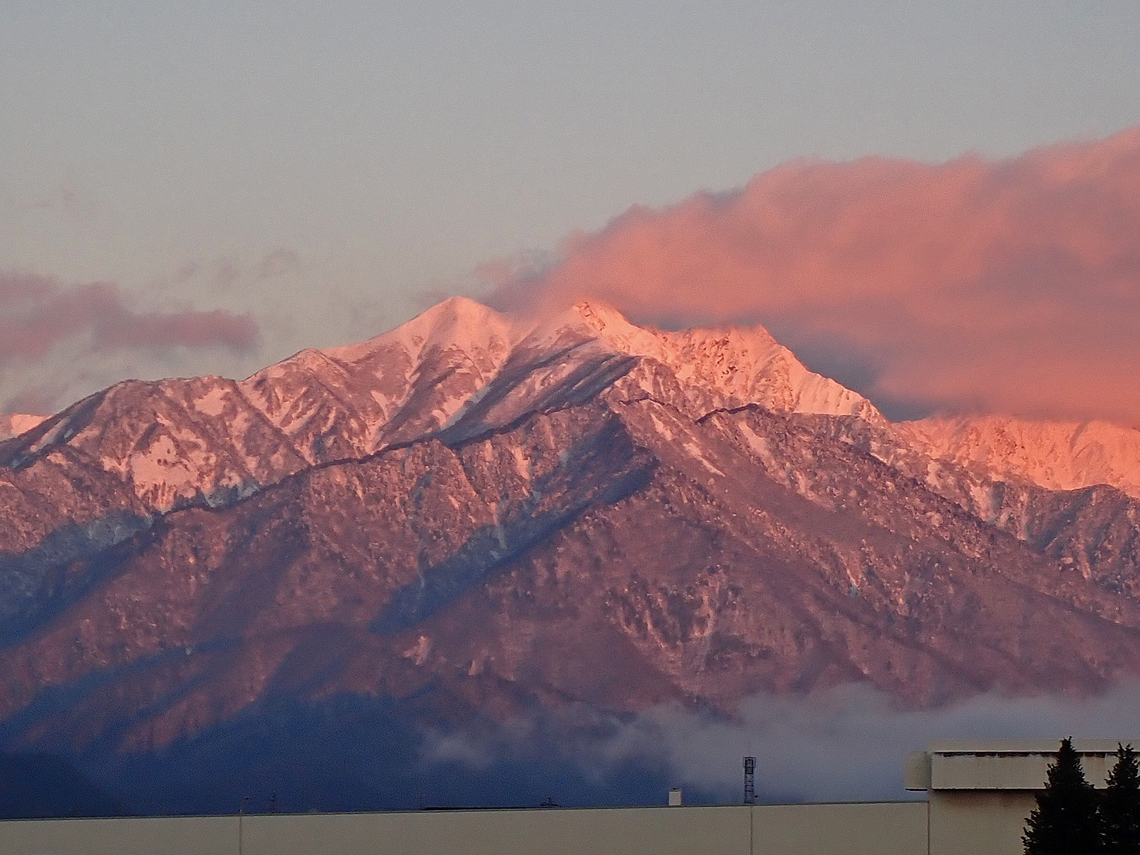 向かう途中で眺めた爺ヶ岳。赤く焼けています。