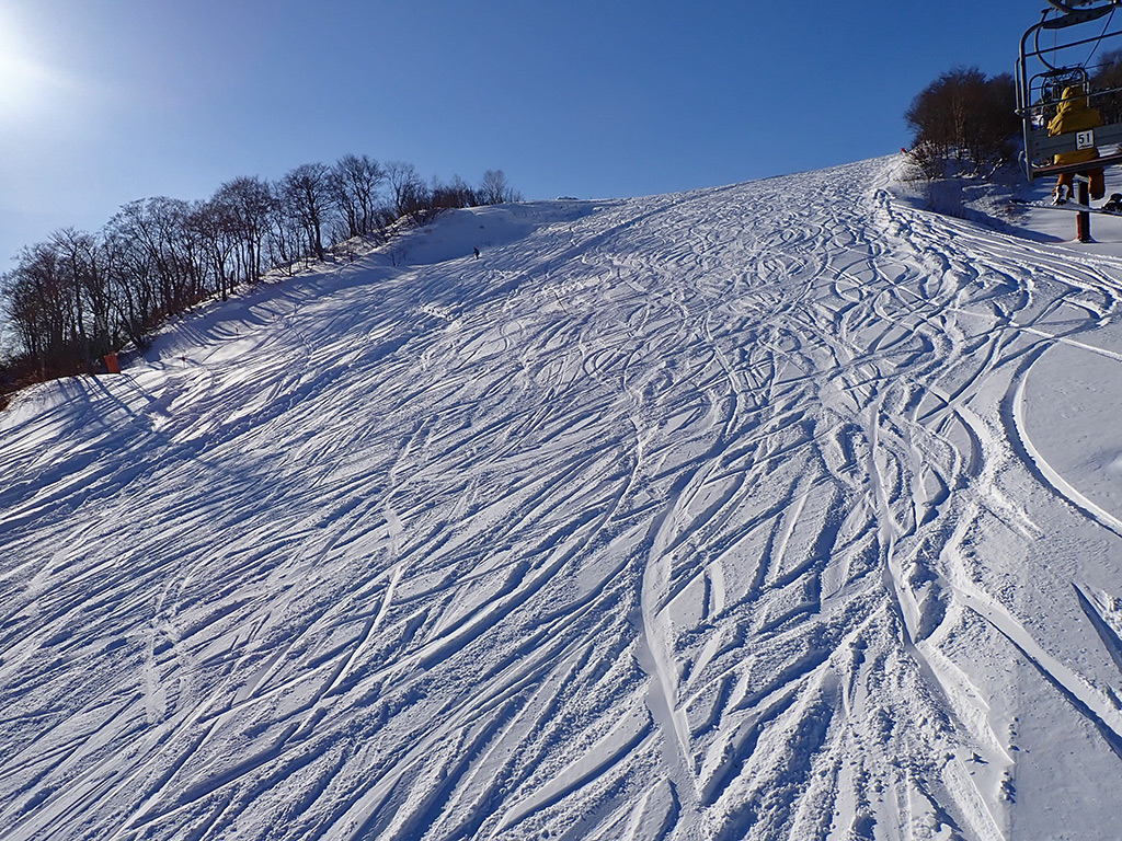 新雪ですが、圧雪された上に15cmほど昨夜の新雪が積もっていて、ここは気持ち良かったですが、私がリフトを降りて滑り始めるころには既に大方ぎだぎだに(^^;。