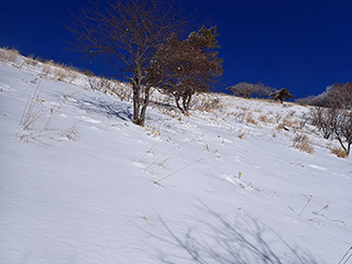 上部の急斜面は雪があまり付いていませんでしたので、雪の多いところまで慎重に下ります。