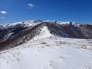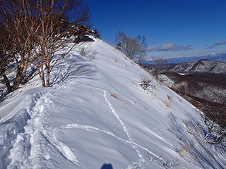 尾根が広くなると、ブッシュだらけ。ここは風が当たりますので、雪は吹き飛ばされてしまっています。