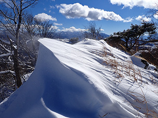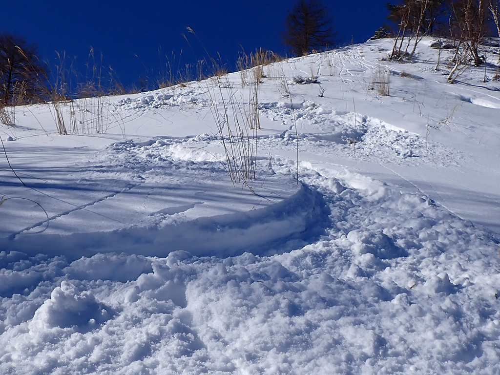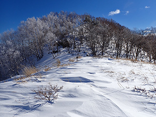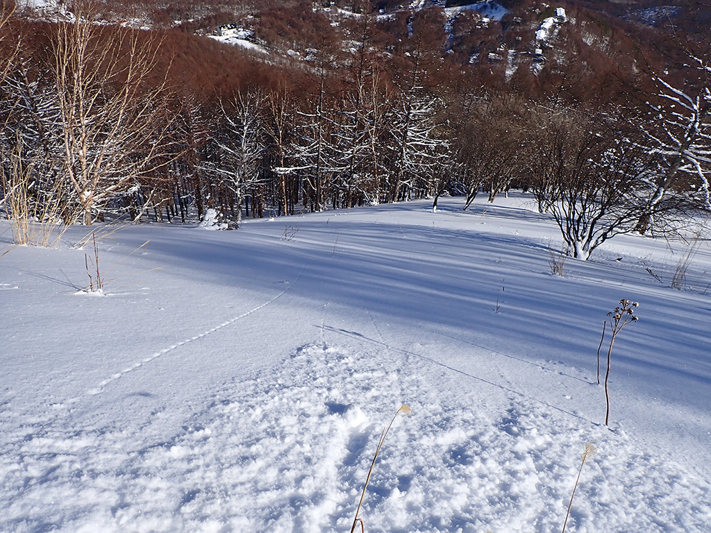 ここから再びフルラッセル。登山道には新雪が30cmほど吹き溜まっていて、スキーでも20cmほどのラッセル。