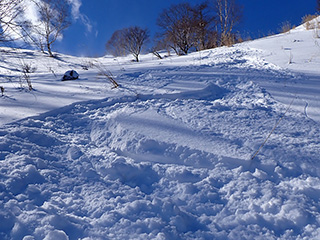 あちゃー、ここはベースが無く、パウダーの下はすぐ地面や岩ということで何度かヒット。思い切り滑れないので、あまり楽しくありません(^^;。