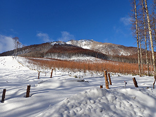 次の写真は車で帰る途中で振り返った殿城山。拡大すると私のシュプールも少しだけ見えています(^^)。