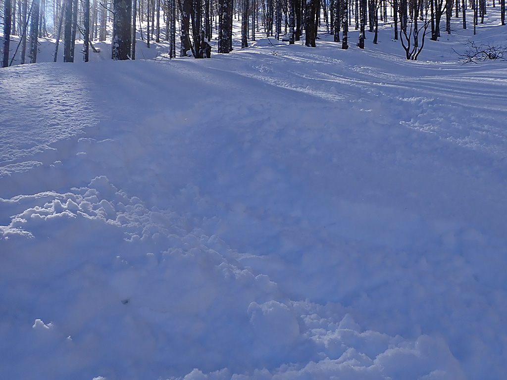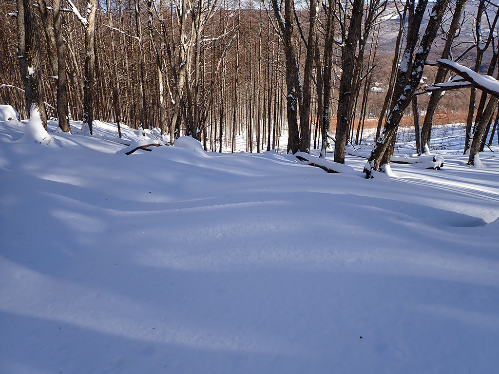 次の林。前回は笹でまくりでしたが、20cmほど積雪が増え、笹はかなり埋まりました。