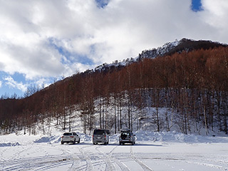 9時40分、エコーバレースキー場の一番上の駐車場に車を駐めました。現在は広く除雪されています。ここまでの道路は圧雪バーンでした。