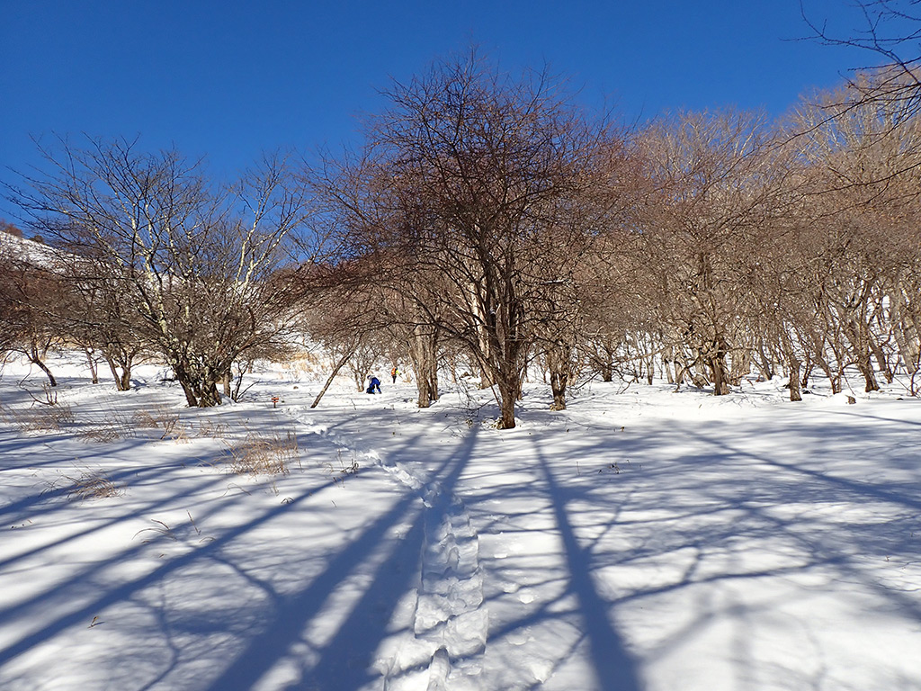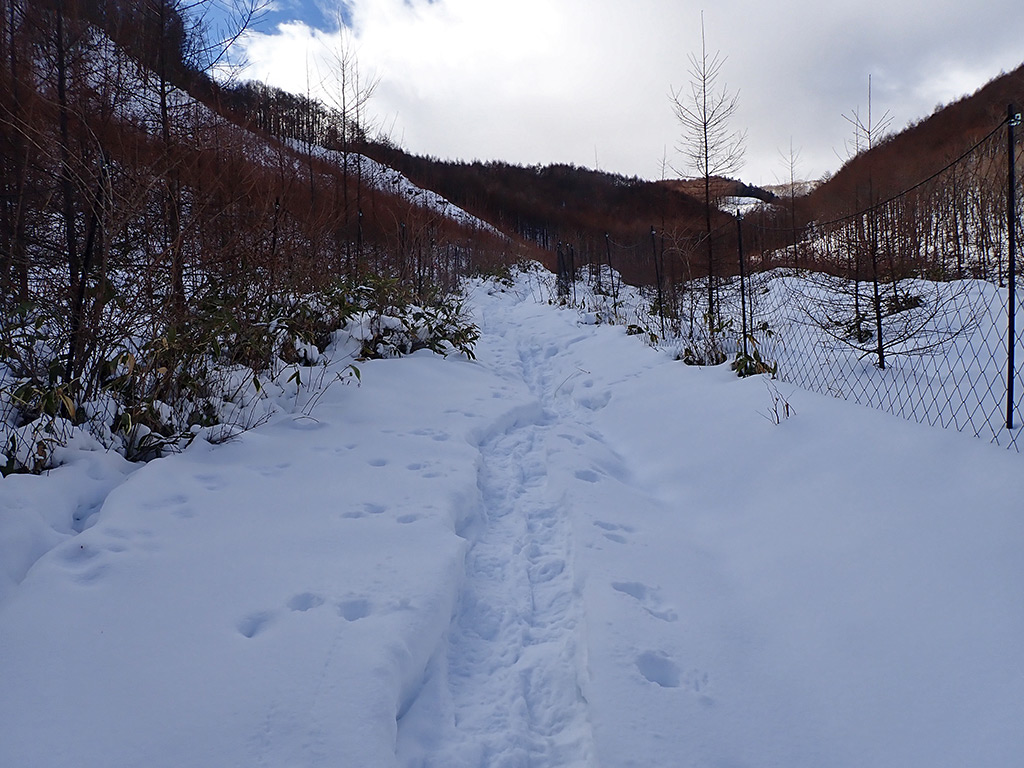 登山道を進みます。登山道は吹き溜まりで積雪40cmほど。スノーシュー等は必須です。