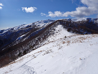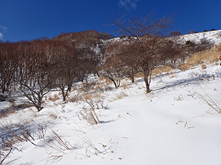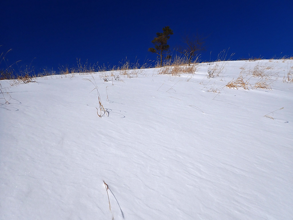 枯れ草が見えているところは踏み抜きやすいので、この真っ白な吹き溜まりの部分を登って行きます。昨夜と思われる新雪が数cm積もっています。