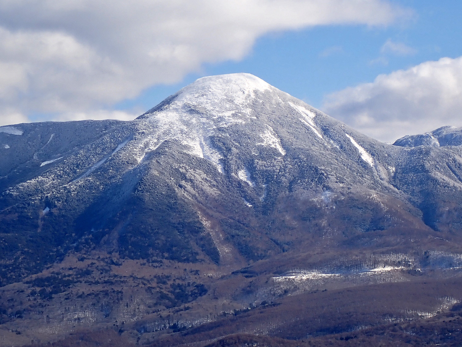 車で帰る途中、殿城山がきれいに見えていたので、車を駐めてパチリ。拡大すると少しだけ私のシュプールも見えています(^^)。滑ったラインを赤くマークしてみました。
