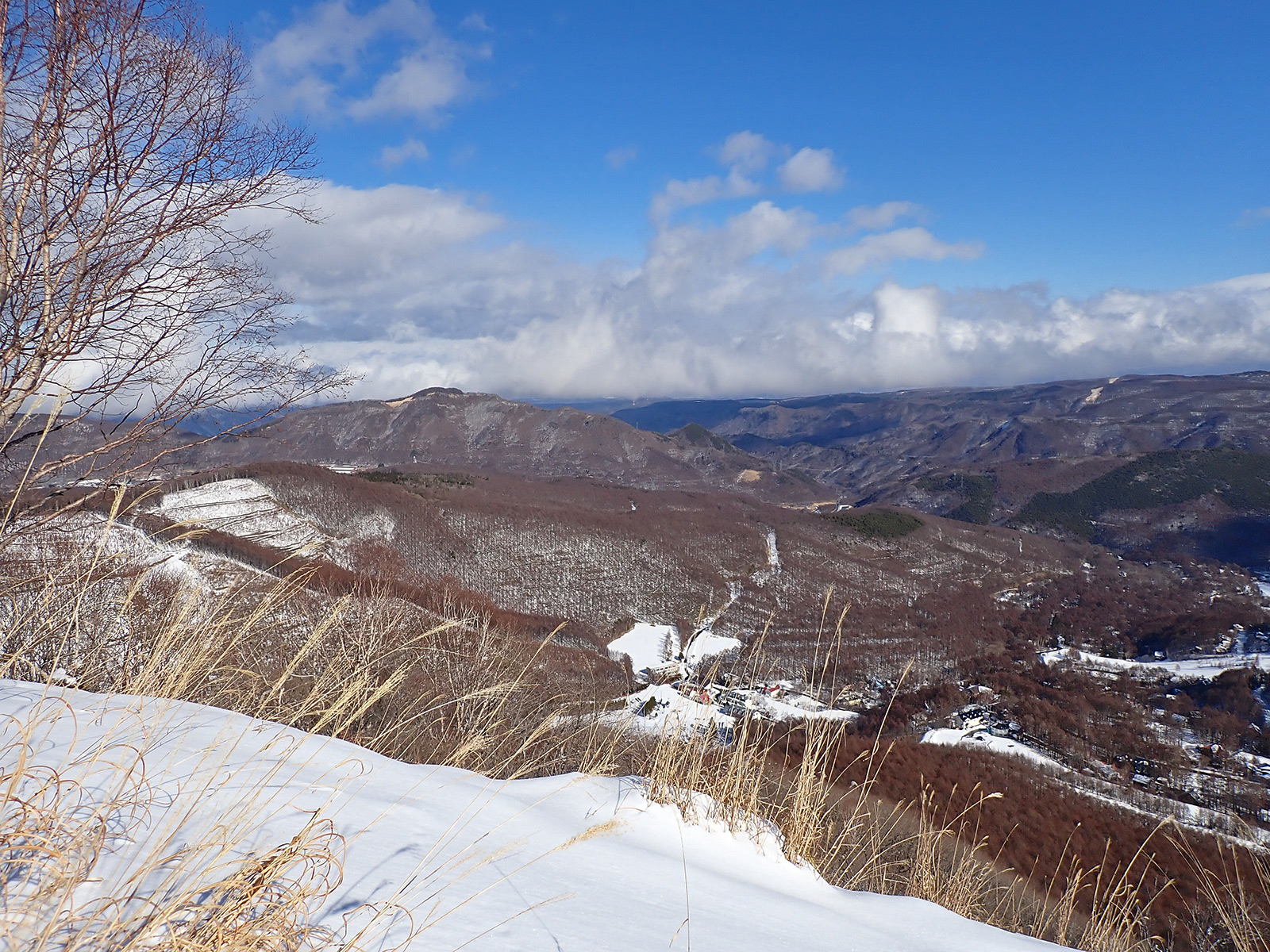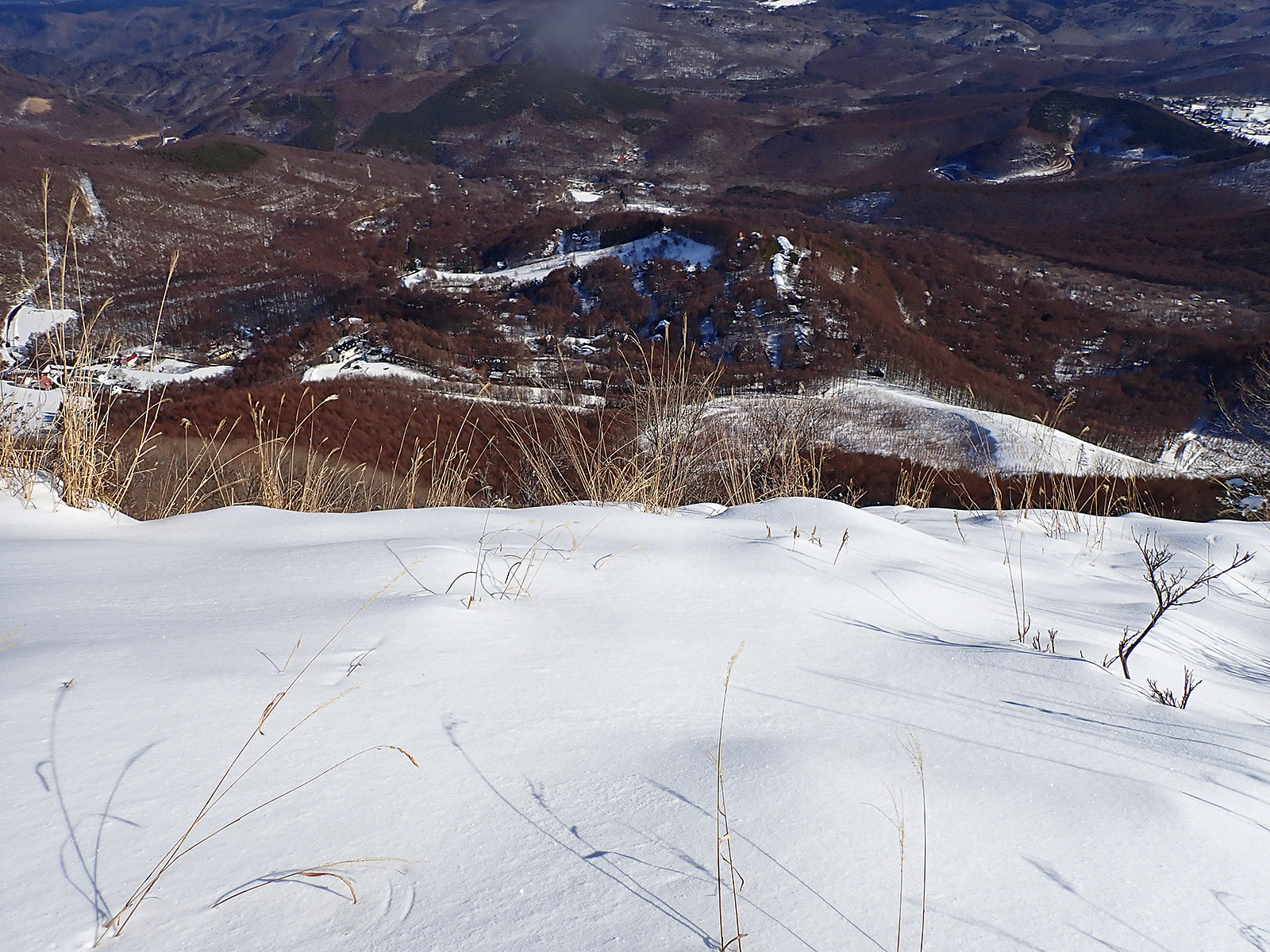 滑り降りてくる斜面。うーん、最後は雪が少なくて苦労しそう。2人分のシュプールがありました。